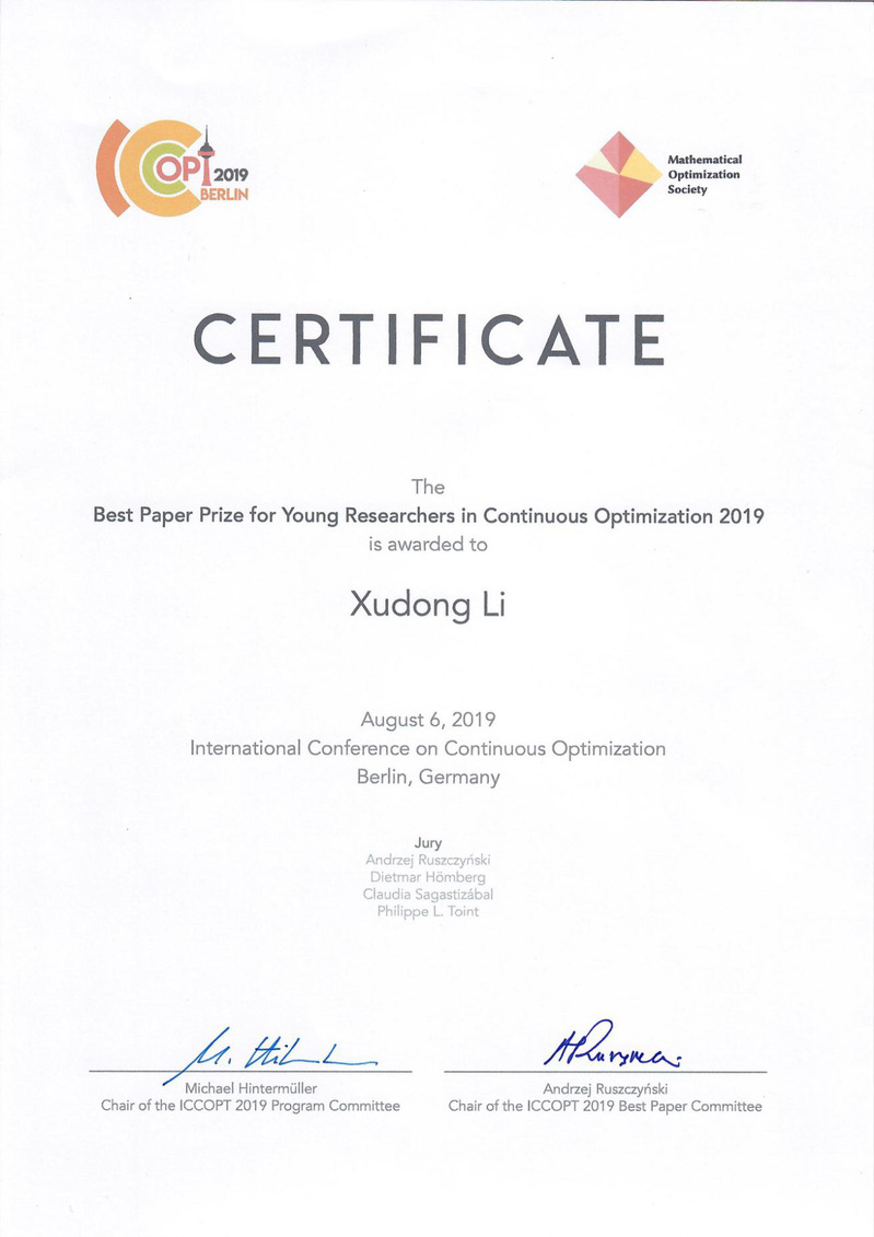 Associate Professor Li Xudong from the School of Data Science won the Best Paper Prize for Young Researchers in Continuous Optimization at the Sixth International Conference on Continuous Optimization (ICCOPT 2019) which was held during August 3-8 in Berlin.