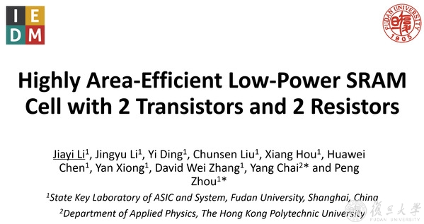 Li Jiayi, a graduate student at the School of Microelectronics, shared his team’s research entitled “Highly Area-Efficient Low-Power SRAM Cell with 2 Transistors and 2 Resistors” at the 65th IEDM (International Electron Device Meeting) on Dec. 10. Li, as the first author, introduced SRAM (Static Random Access Memory), completed and verified at Fudan, consisting of the fewest units in the world.