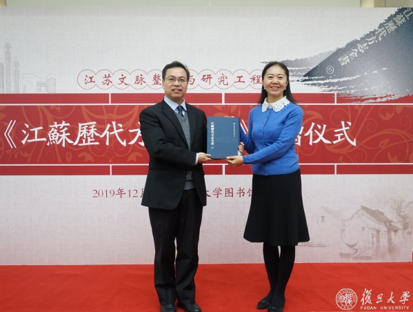 The donation ceremony of A Chronicle of Jiangsu Province was held at Fudan University Library on December 25. As a major cultural project that inherits and protects the outstanding cultural and historical heritage of Jiangsu province, the Chronicle contains about 600 types of old local chronicles at all administrative levels in Jiangsu. It systematically describes the environment, politics, economics, culture and society in various areas in Jiangsu at different periods before 1949, which serves as precious source of geographical information and cultural heritage.