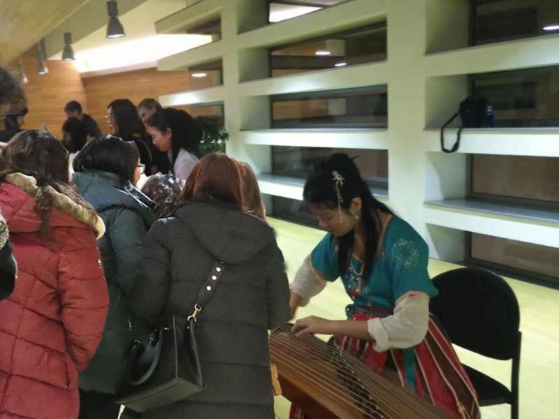 With a rich program of traditional and modern Chinese dances and songs, the show presented a vivid picture of campus life in both ancient and contemporary China to an audience of around 700 people. Even before the show, the audience got a close glimpse of the traditional Chinese culture, participating in a calligraphy event and watching a Guzheng (Chinese plucked string instrument) performance,. People waited in long queues to have amateur calligraphers write new year wishes on their fans.