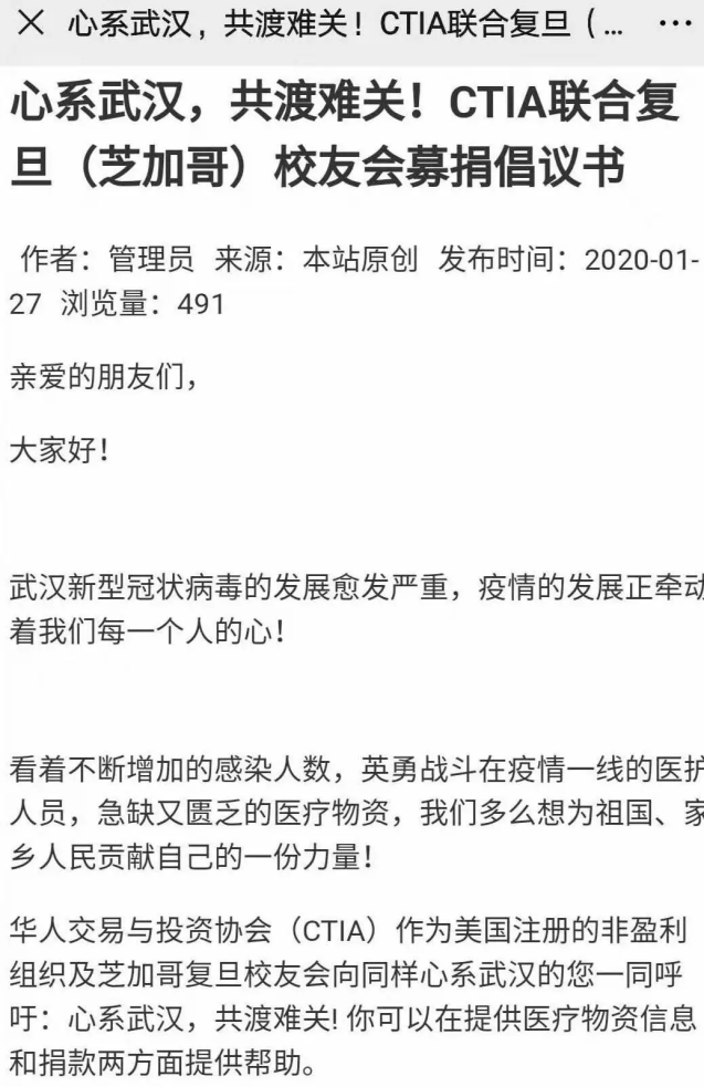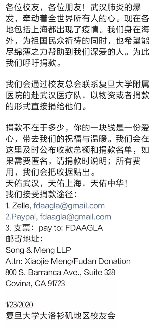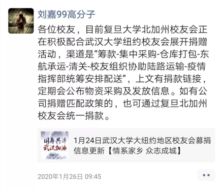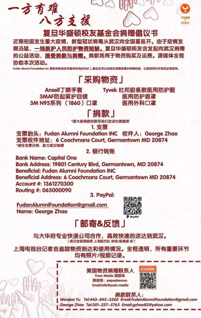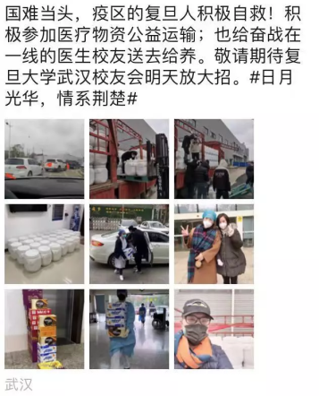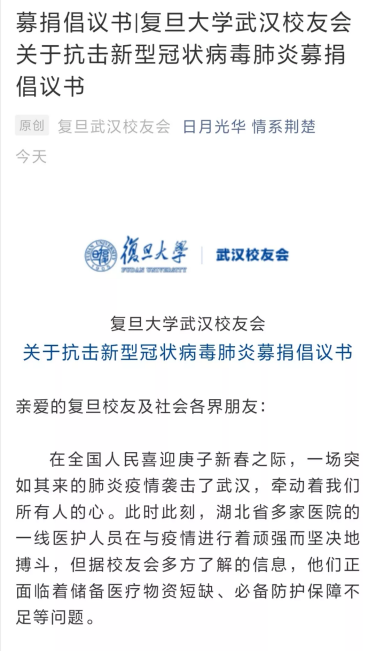 Fudan Wuhan Alumni Association released a donation call to send medical supplies on the frontline and raise funds for the medics on Jan. 28.