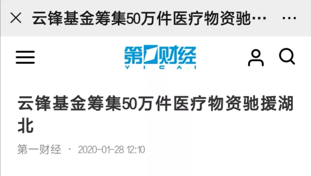 Yunfeng Capital has raised 500,000 pieces of medical supplies worldwide, including N95 masks, FFP2 masks, medical protective outfits and disinfectant. Nearly 100,000 FFP2 masks reached Hubei Province on Jan. 27.