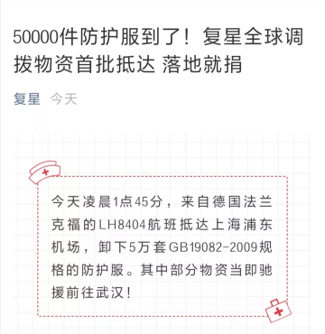 Fosun Group has purchased and donated 600,000 pieces of medical supplies worldwide, including 330,000 medical masks and 270,000 protective outfits. 50,000 outfits have reached Shanghai on Jan. 28.