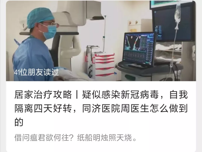 This article by Fudan alumnus Dr. Zhou Ning introduces his own expereince of home-based treatment has been read by over 20 million people, which has to a large extent relieved panic over NCP.