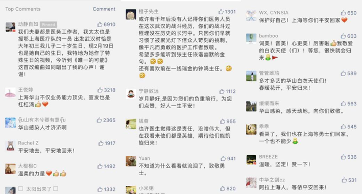 The most-upvoted comment came from a doctor who said, “Both my wife and I are medical workers. She left for Wuhan on our son’s twentieth birthday on the 3rd day of the Chinese New Year. Now her birthday is approaching and I have made a video to celebrate her birthday. This song literally speaks to my soul.” It received nearly 7,000 likes.