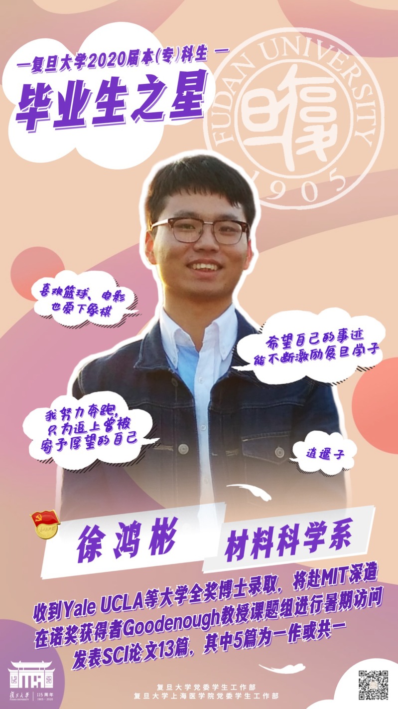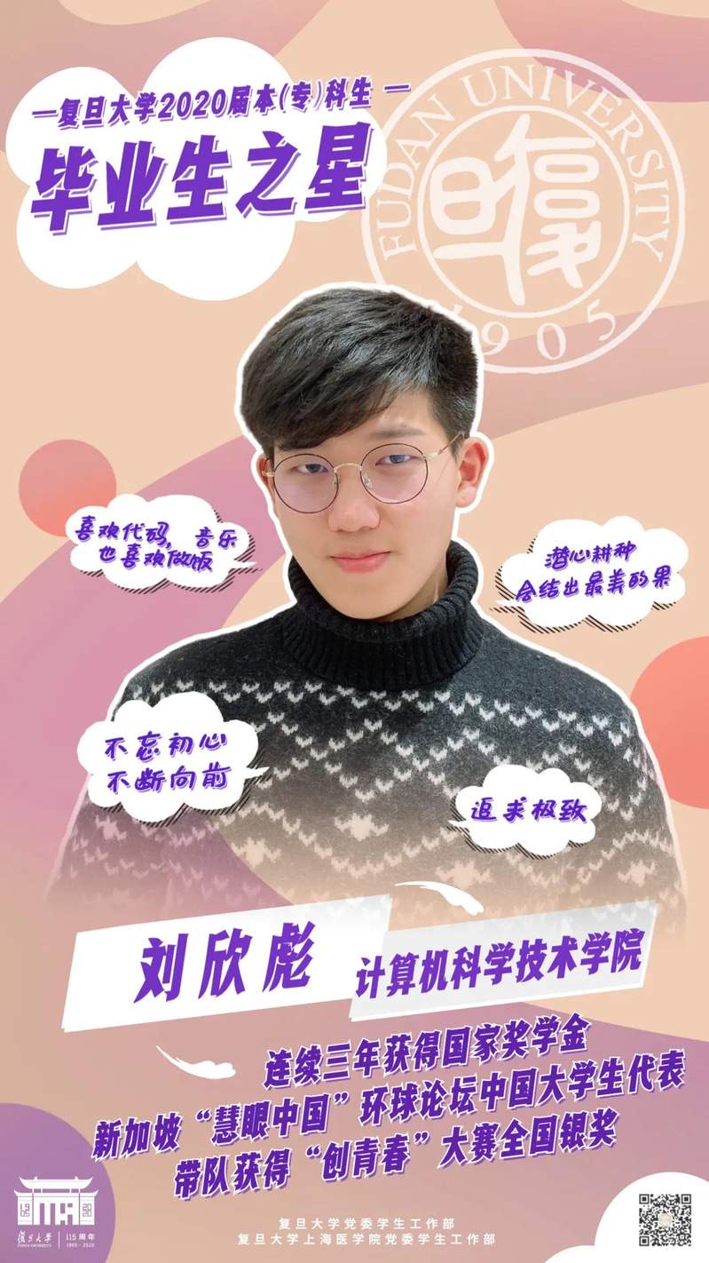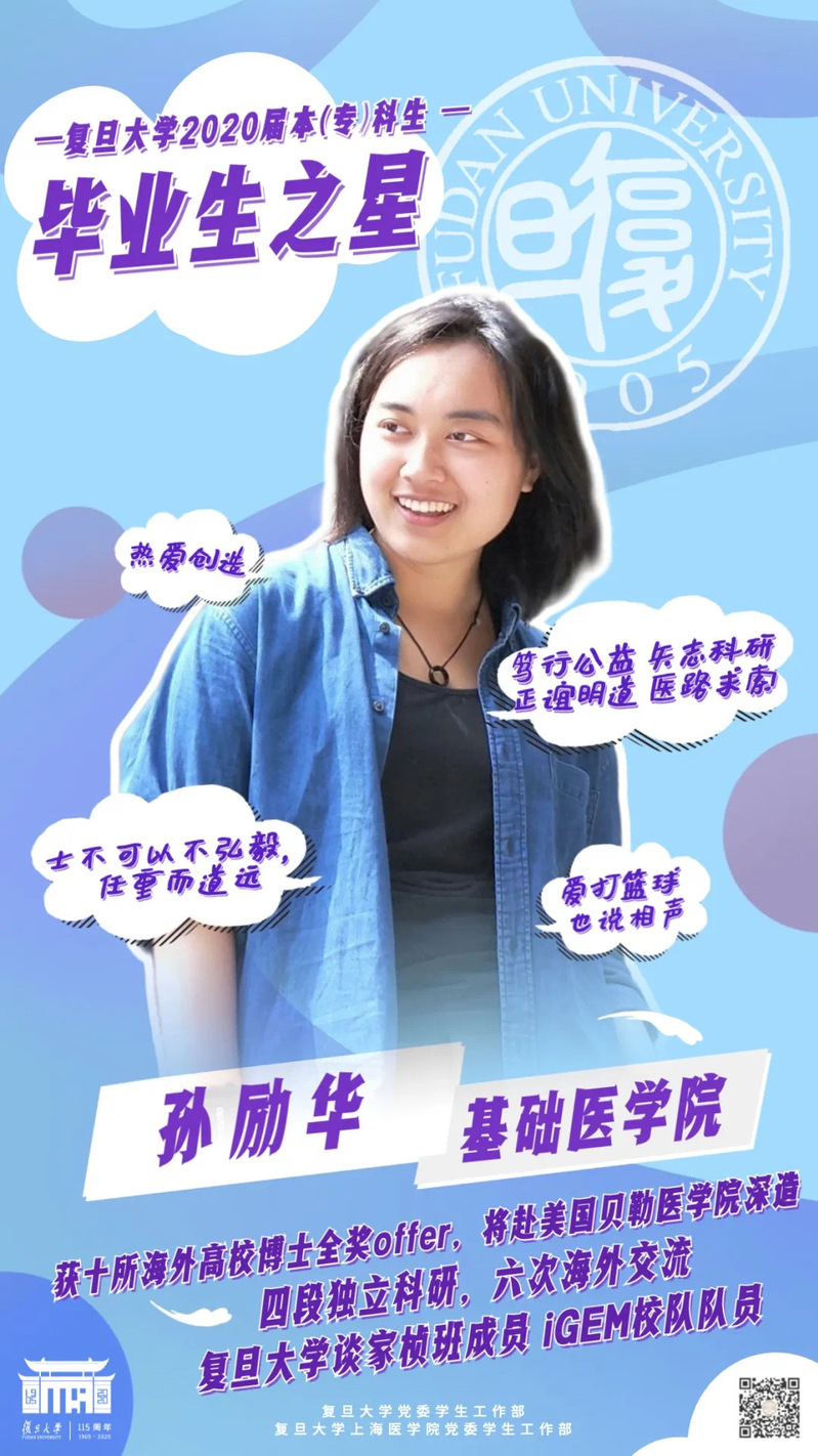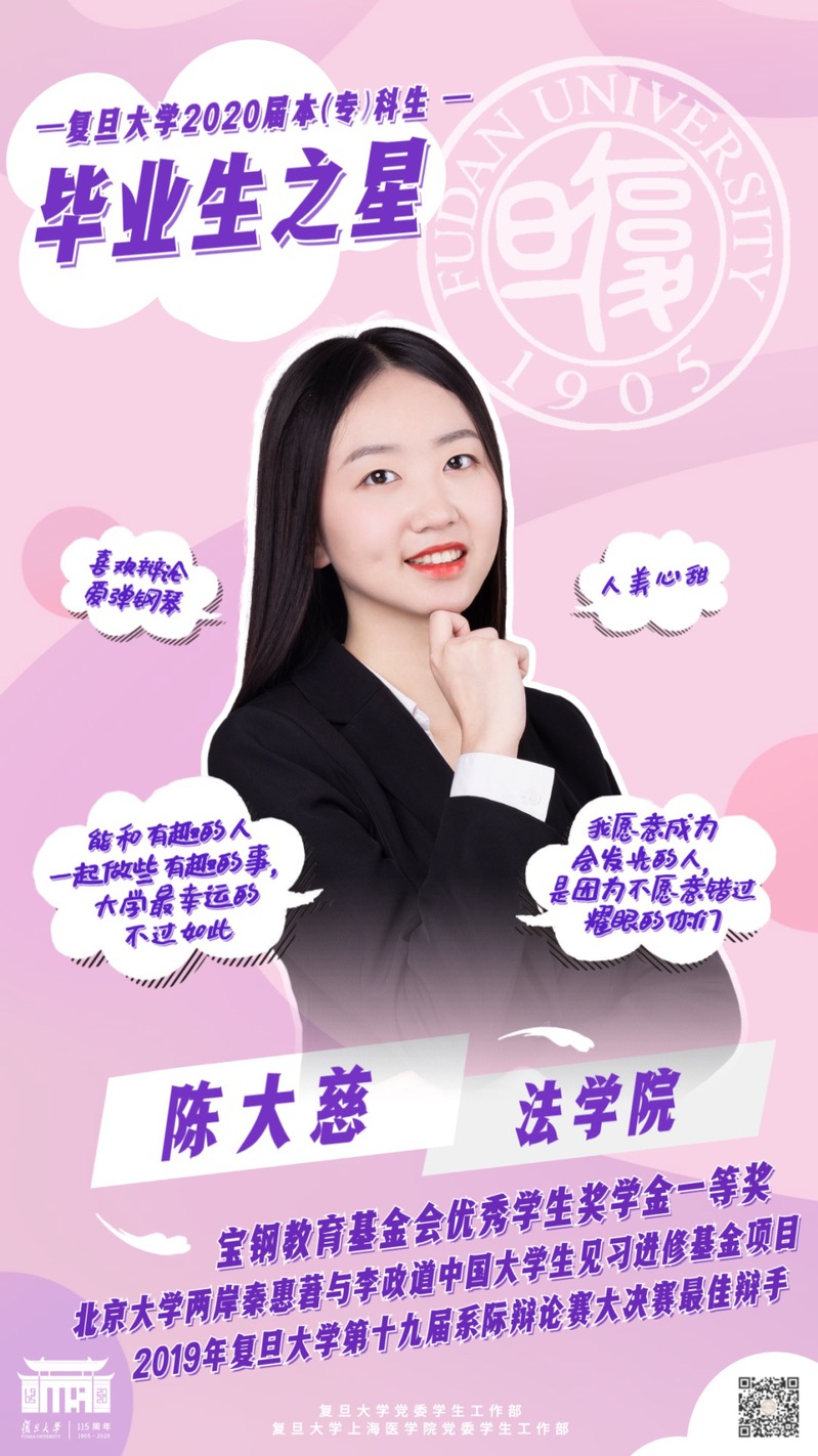Every year, Fudan announces ten winners of the “Graduation Star” title, the highest honor a Fudan undergraduate can earn. It is presented to the best students who are going to graduate from the university with a bachelor’s degree that year. The winners should demonstrate academic and research excellence as well as valuable qualities including diligence, perseverance, kindness, courage, enterprise, etc.