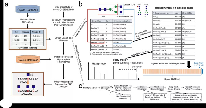 Weiqian Cao, associate researcher at Institutes of Biomedical Sciences, Fudan University, and Wenfeng Zeng, doctor student at Institute of Computing Technology, CAS, presented a glycan-first glycopeptide search engine, pGlyco3, to comprehensively analyze intact N- and O-glycopeptides, including glycopeptides with modified saccharide units. A glycan ion-indexing algorithm developed for glycan-first search makes pGlyco3 5–40 times faster than other glycoproteomic search engines without decreasing accuracy or sensitivity.
