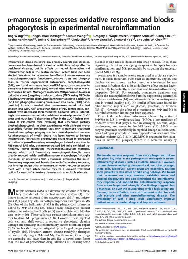 The research article entitled “D-mannose suppresses oxidative response and blocks phagocytosis in experimental neuroinflammation” has been published in Proceedings of the National Academy of Sciences.