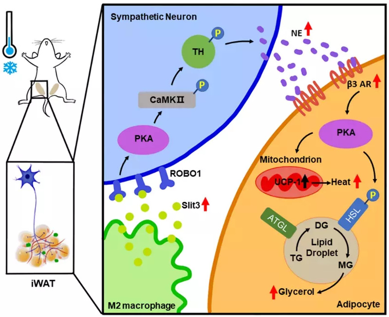 Research team led by Qiqun Tang, professor at School of Basic Medical Sciences, Fudan University, and Shuwen Qian, associate researcher at School of Basic Medical Sciences, Fudan University, has shown that the macrophage cytokine Slit3 is secreted by adipose tissue macrophages and promotes cold adaptation by stimulating sympathetic innervation and thermogenesis in mice. Analysing the transcriptome of M2-like macrophages in murine inguinal WAT (iWAT) after cold exposure, the researchers identify Slit3 as a secreted cytokine. Slit3 binds to the ROBO1 receptor on sympathetic neurons to stimulate Ca2+/calmodulin-dependent protein kinase II signalling and norepinephrine release, which enhances adipocyte thermogenesis.