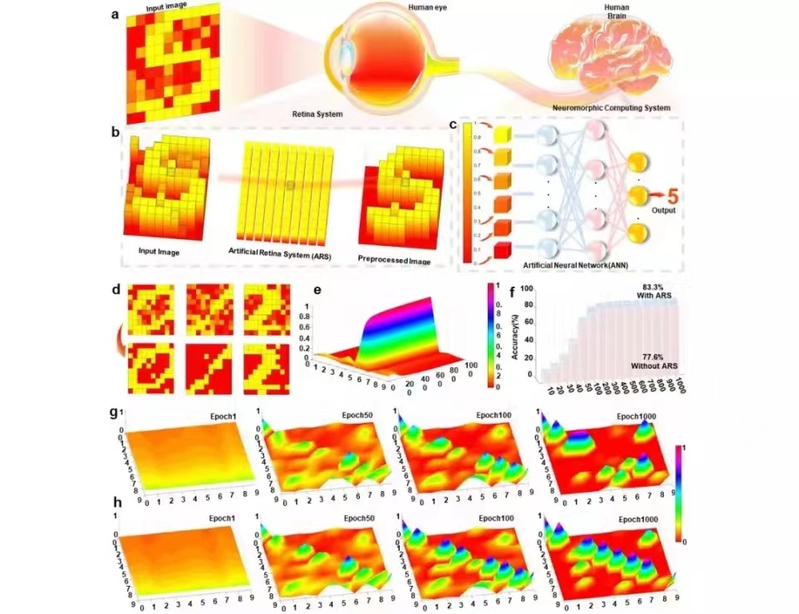 Inspired by biological eyes, an artificial retina based on 2D Janus MoSSe was fabricated by the team of Lin Chen, professor at School of Microelectronics. The artificial retina could simulate functions of visual perception with electronic/ion and optical comodulation. Furthermore, inspired by human brain, sensing, memory, and neuromorphic computing functions were integrated on one device for multifunctional intelligent electronics, which was beneficial for scalability and high efficiency. On the basis of the optoelectronic performances, light adaptation of biological eyes, preprocessing, and recognition of handwritten digits were implemented successfully. This work may provide a strategy for the future integrated sensing-memory-processing device for optoelectronic artificial retina perception application.