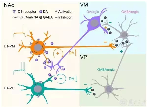 Dopamine (DA) level in the nucleus accumbens (NAc) is critical for reward and aversion encoding. The team led by Xing Liu, associate professor at School of Basic Medical Sciences, and Lan Ma, professor at State Key Laboratory of Medical Neurobiology, reports that the ventral pallidum (VP) projection of NAc D1-MSNs (D1NAc-VP) is inhibited by rewarding stimuli and activated by aversive stimuli. In contrast to the VM projection of D1-MSN (D1NAc-VM), activation of D1NAc-VP projection induces aversion, but not reward. D1NAc-VP MSNs are distinct from the D1NAc-VM MSNs, which exhibit conventional functions of D1-MSNs. Activation of D1NAc-VP projection stimulates VM GABAergic transmission, inhibits VM DAergic neurons, and reduces DA release into the NAc. Thus, D1NAc-VP and D1NAc-VM MSNs cooperatively control NAc dopamine balance and reward-aversion states.