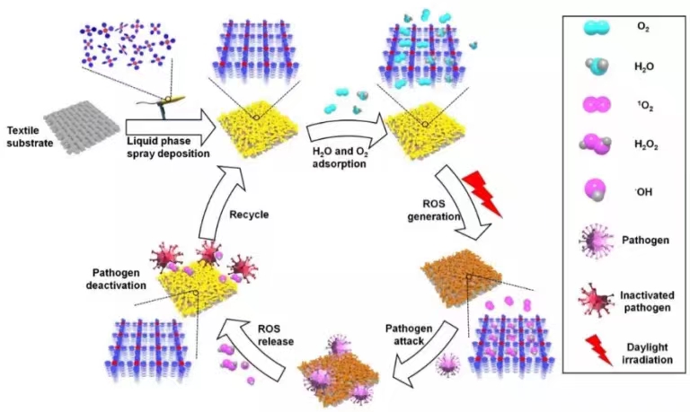 The team led by Peng Li, professor at Department of Chemistry, prepared a series of photoactive coating materials based on the crystalline porous molecular frameworks. These solution-processable porous coating materials have been fabricated on various fibers by using a liquid-phase spray deposition method (LPSD). These porous textile coatings are able to spontaneously convert adsorbed oxygen from air into reactive oxygen species (ROS) upon daylight irradiation, and store these ROS for at least 12 hours after irradiation. The unique spontaneous ROS generation and sustained storage properties of these hydrogen-bonded organic frameworks (HOFs) make them highly reactive and self-cleaning materials capable of preventing and suppressing bacterial infections regardless of whether they are employed under bright or dark conditions with daylight pre-irradiation.