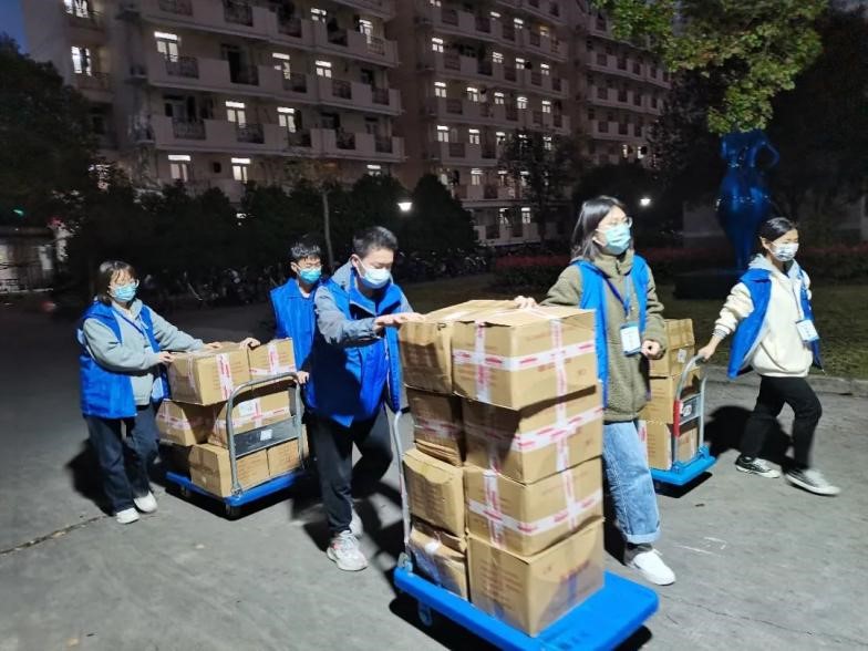 On March 26, 30,000 bags of walnut products donated by Yongping E-commerce Center and 2,112 bags of pickles donated by Yongping’s Aqingsao Food Company arrived at Fudan University.