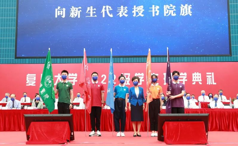 Jiao Yang, chair of Fudan University Council, presented the Fudan College flags to the freshmen representatives. The five Fudan Colleges, named after five late presidents of Fudan University, are homes of the undergraduate students in Fudan for their after-class activities, which play a key role in boosting students’ academic interest and extracurricular accomplishment.