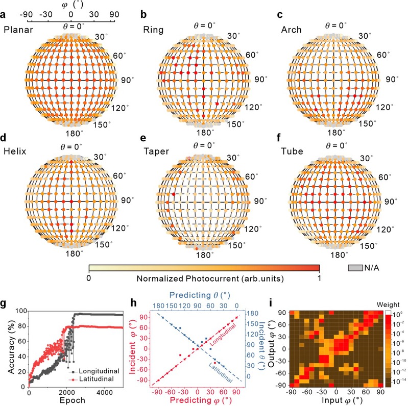 Figure 2 Three-dimensional incident light response of (a) plane, (b) ring, (c) arch, (d) helix, (e) taper and (f) tube photodetector. (g) The epoch-dependent recognition accuracy of training set in longitudinal and latitudinal direction using DNN. (h) Angle identification of incident angle in longitudinal (φ= 0°) and latitudinal (θ= 40°) direction. (i) Weight mapping of output angles and input angles of longitudinal direction (φ= 0°).