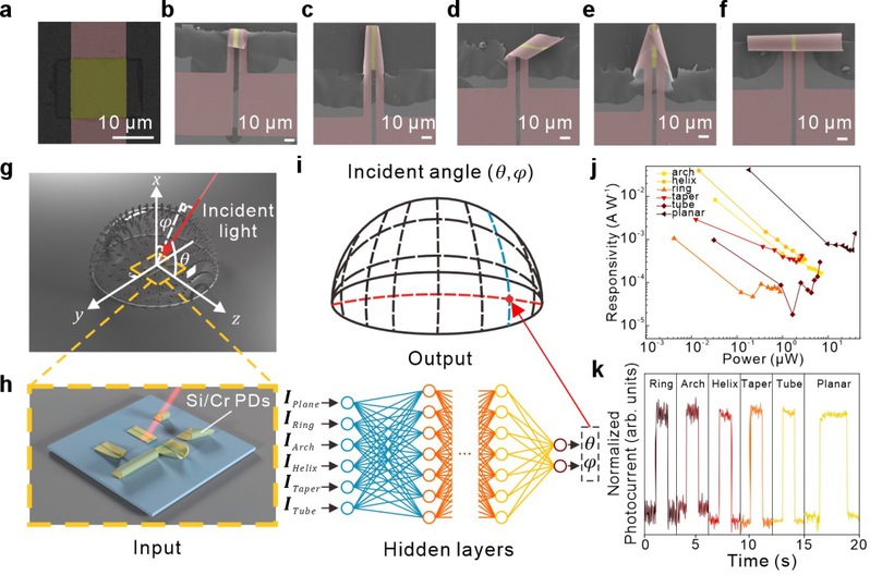 The research team proposed a multi-level quasistatic finite element analysis method and prepared six types of silicon/chromium nanomembrane assembly three-dimensional(3D) microstructures and corresponding three-dimensional photodetectors based on the method (Figure 1(a)-(f)). The team proposed to utilize 3D-structured photodetectors with different structures and deep neural network algorithms to analyze the response of each photodetector to the incident light in different angles, and then realize 3D angle-sensitive photodetection of incident light. (Figure 1(g)-(i)). It is shown that the 3D-structured nanomembrane photodetectors display excellent photoresponse in the visible range as well as sub-millisecond response times (Fig. 1(j)-(k)), which are sufficient to support the construction of the photodetection dataset in the deep neural network algorithm.