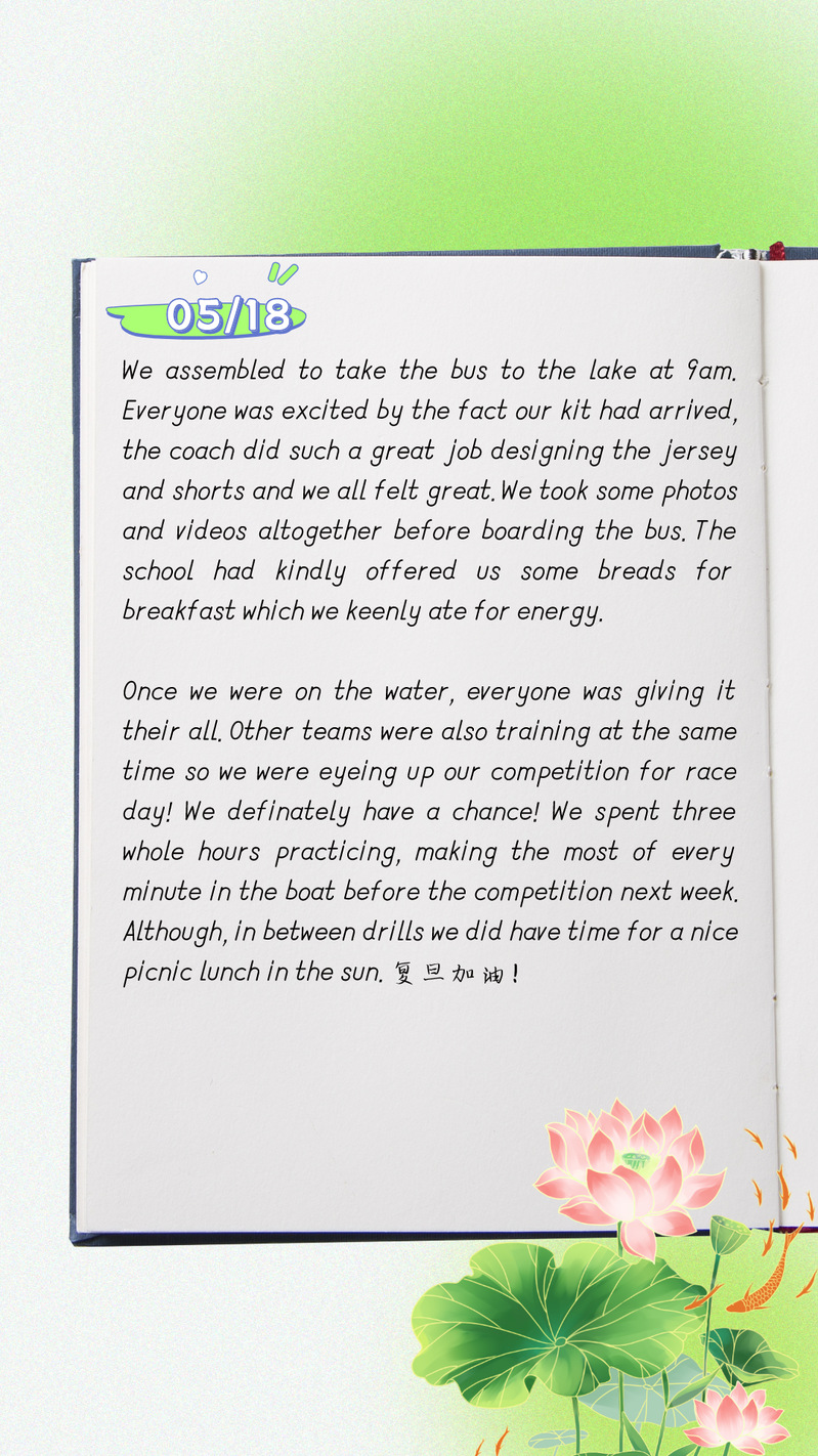 Anna Bulman from England studying at the International Cultural Exchange School is a member of this year’s Fudan International Students Dragon Boat Team. She kept a logbook to record the team’s training during the past month and the racing day. Tap the picture below to see how Anna grew to become a dragon boat racer.