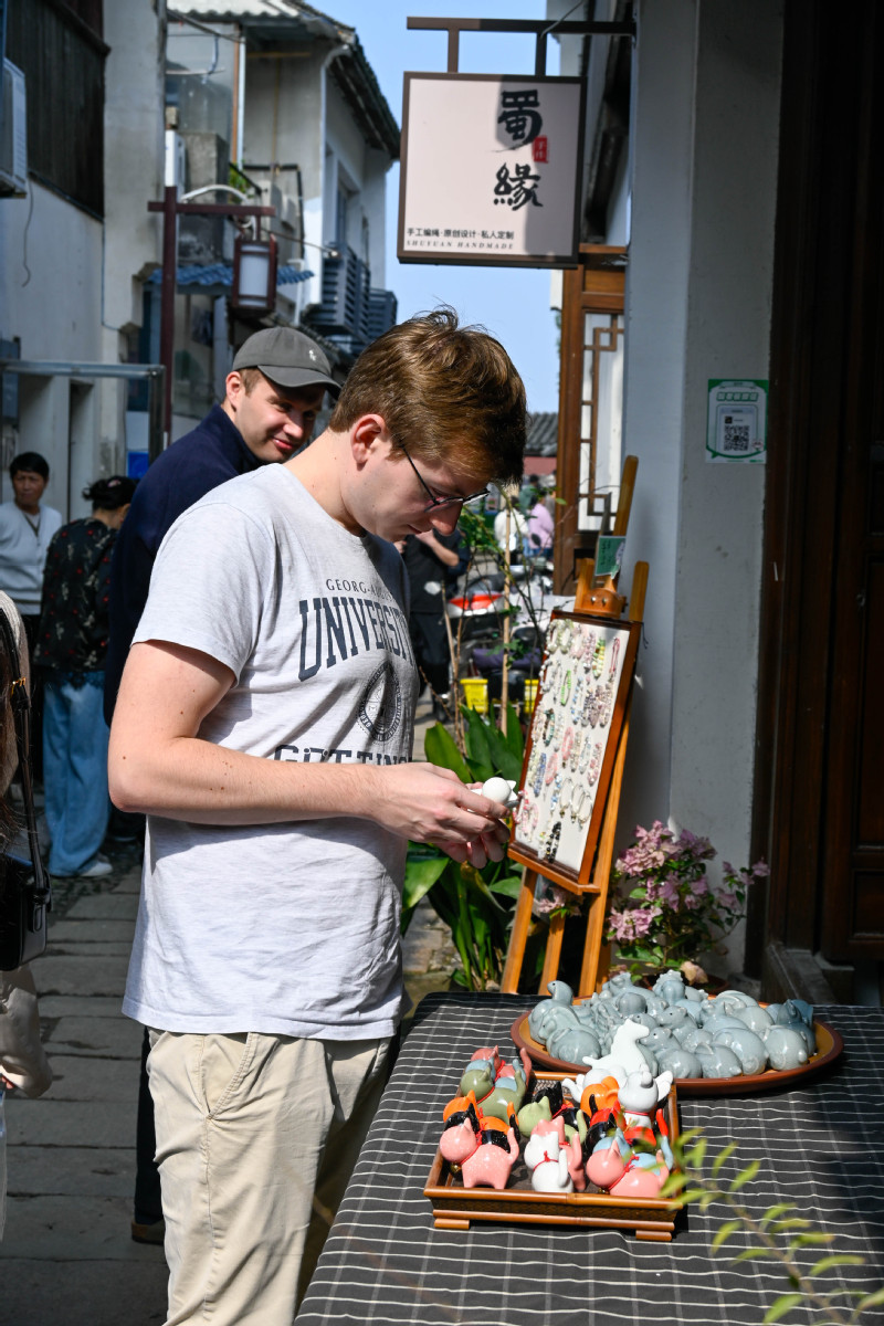 The rich clay deposits beneath the city made Zisha or “Purple Clay” Teapots long sought after by tea drinkers and scholars of China, and such teapots have been exported to Europe since the 17th century. Paul Pillsticker, a student from the University of Göttingen, got himself a Zisha cat figurine. “It’s great that they have so many figures made from the clay. I chose the cat as a gift for my mom because she likes cat a lot,” Paul said.