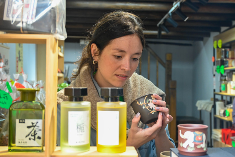 Maria is checking out a tea cup in a shop on Shushan Ancient South Street