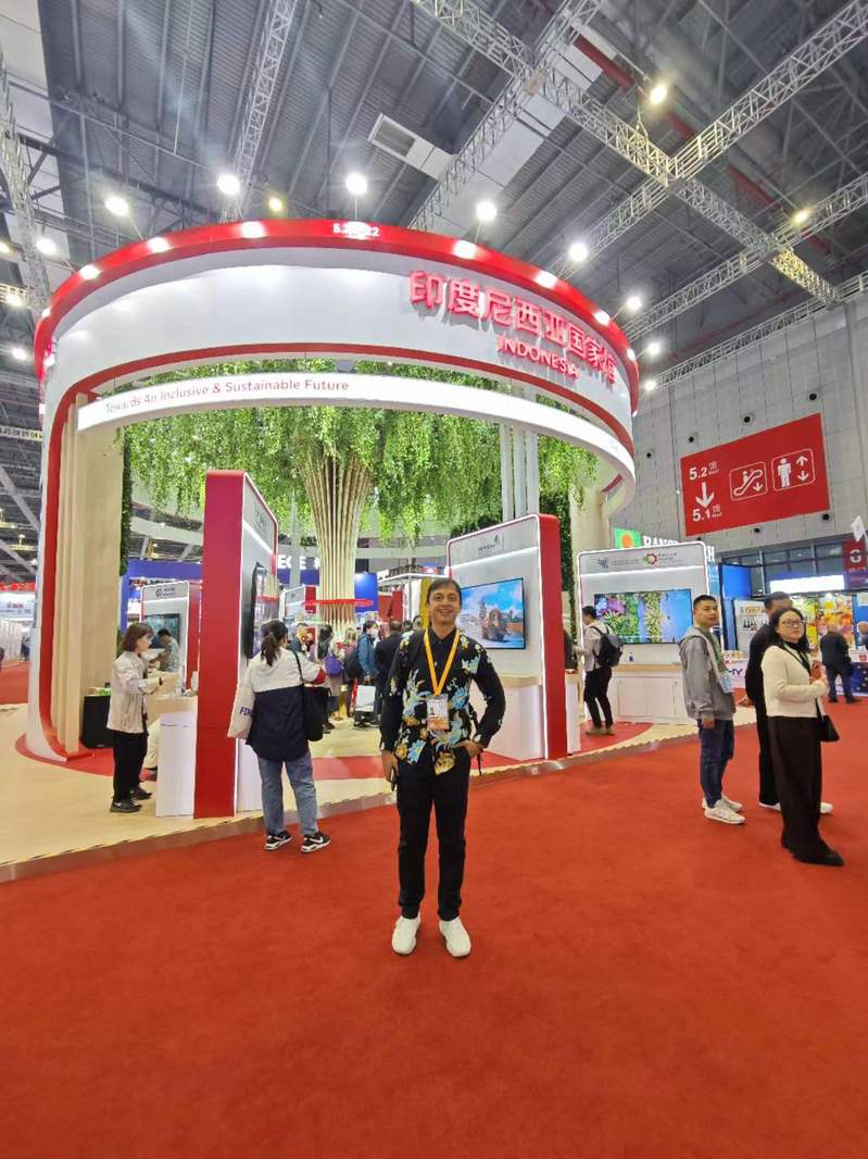 Choiruzzad poses in front of the Indonesia Booth at CIIE
