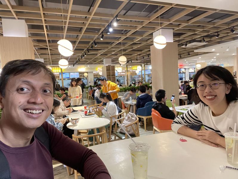 Choiruzzad poses with a colleague inside a canteen on Jiangwan Campus