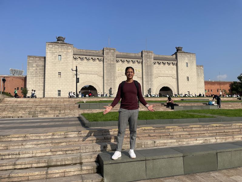 Choiruzzad poses in front of Jiangwan Stadium, Shanghai