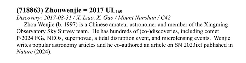 This month, the International Astronomical Union (IAU) announced the naming of asteroid 718863 as “Zhouwenjie” in honor of ZHOU Wenjie, a 2019 undergraduate and 2022 master’s graduate from the Department of Chinese Language and Literature at Fudan University. In WG Small Body Nomenclature Bulletin (Volume 5, #20), the asteroid located in the main belt between Mars and Jupiter orbits the Sun every 4.34 years, symbolizing Zhou’s enduring contributions to amateur astronomy.