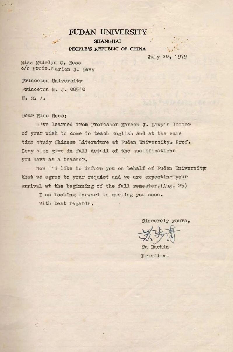 In July 1979, Ross received a brief letter from SU Buqing, then president of Fudan University, inviting her to teach English while learning Chinese at Fudan. The closing line “We are expecting your arrival at the beginning of the fall semester” put her on a plane to Shanghai a few weeks later and launched what she still calls her unforgettable “work-study” life at Fudan.