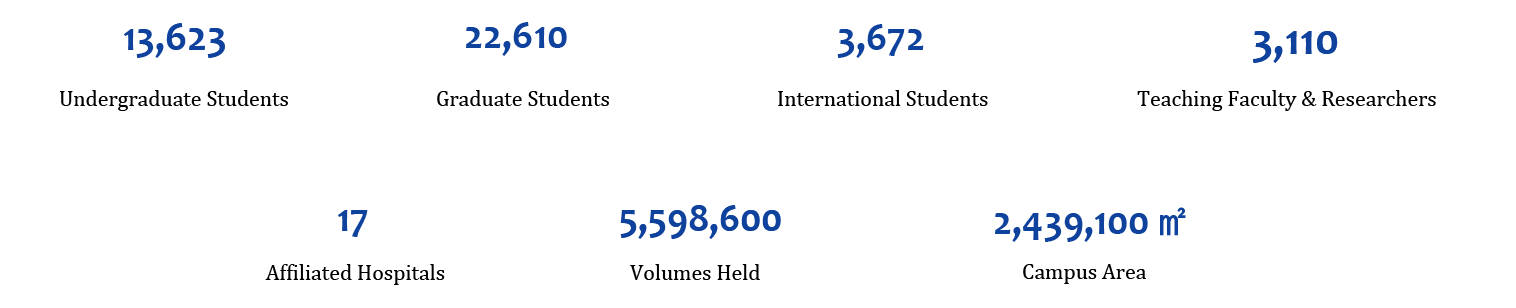 The university is comprised of 35 schools (or departments) and 17 affiliated hospitals (4 are still under construction) with 76 bachelor degree programs, 43 master degree programs of first-level academic disciplines, 37 doctoral degree programs of first-level academic disciplines, 32 master professional degree programs, 4 doctoral professional degree programs and 35 post-doctoral fellowship programs.